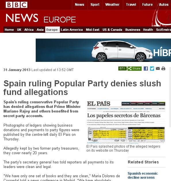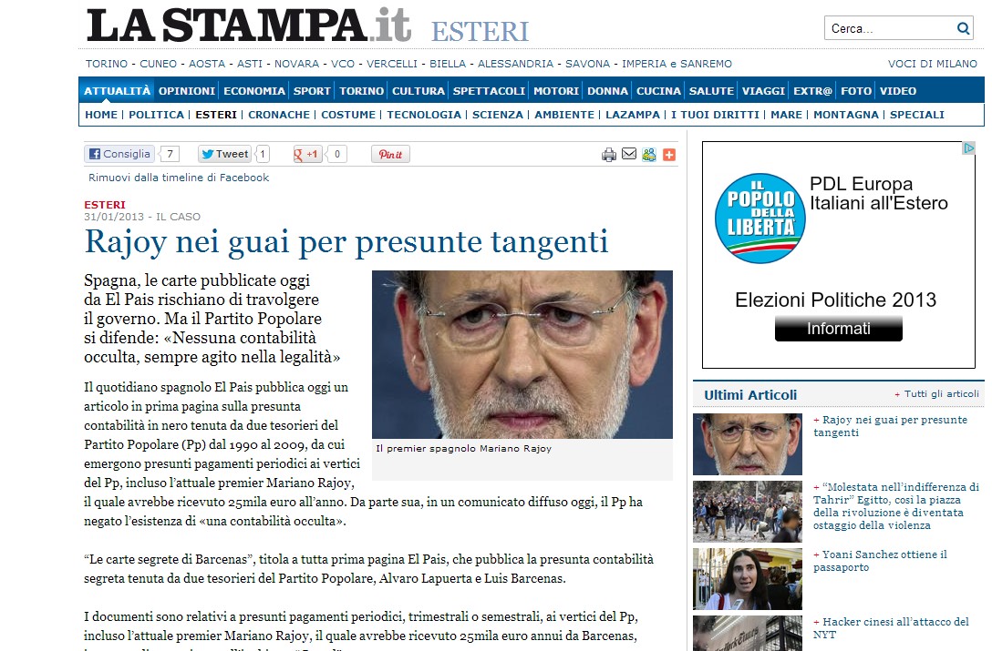 Por su parte, el diario italiano La Stampa informa que "Rajoy, en problemas por supuesto soborno"