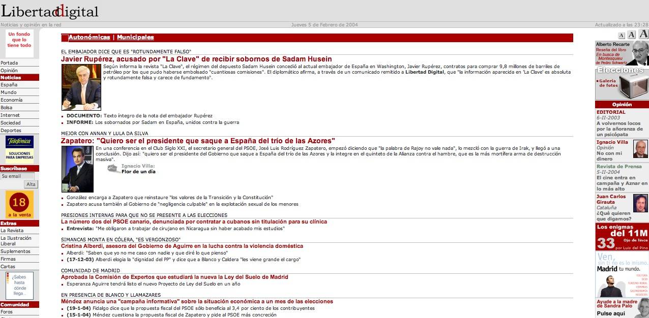 Tal día como hoy, 5 de febrero, pero de 2004, Libertad Digital llevaba en su portada uno de los deseos de José Luis Rodríguez Zapatero si conseguía la victoria en las elecciones del 14 de marzo de 2004. Titulaba LD: "Zapatero: "Quiero ser el presidente que saque a España del trio de las Azores"".