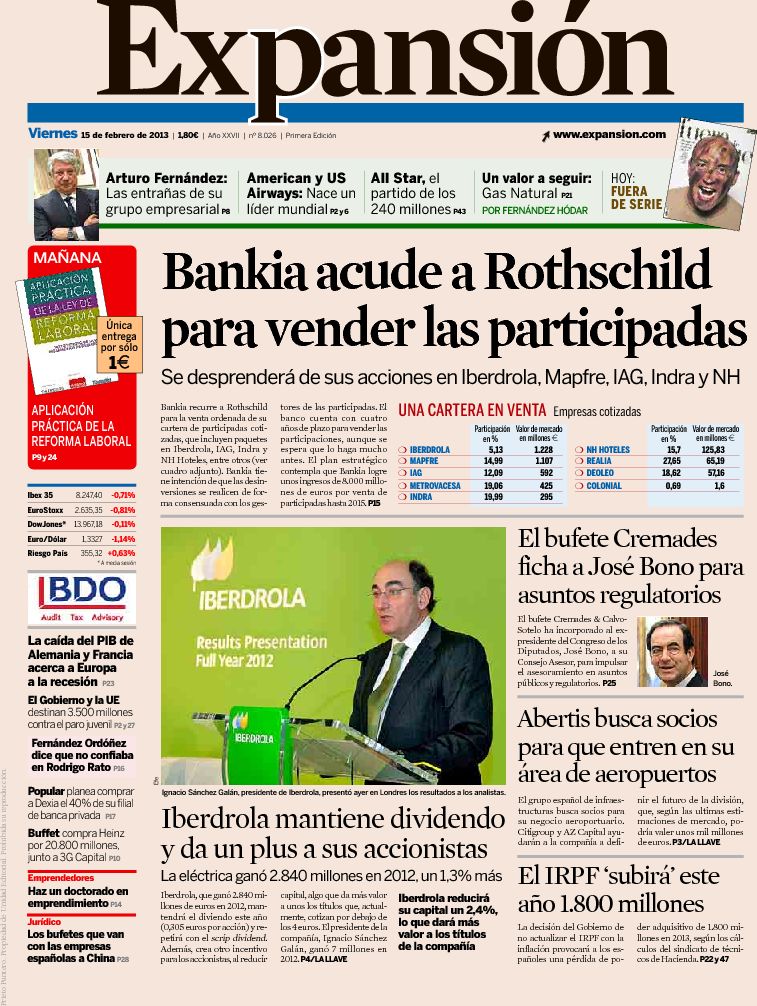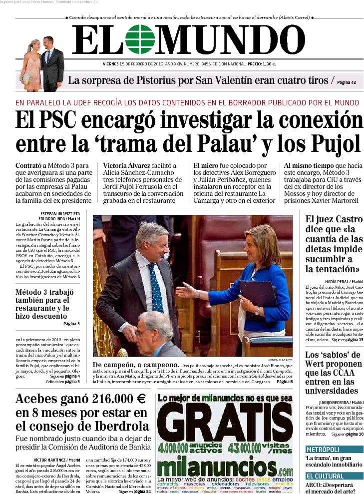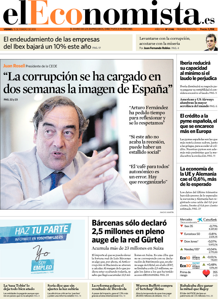 "Juan Rosell: 'La corrupción se ha cargado en dos semanas la imagen de España'", "Bárcenas sólo declaró 2,5 millones en pleno auge de la red Gürtel"