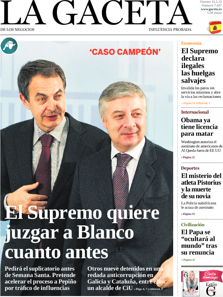 "El Supremo quiere juzgar a Blanco cuanto antes", "Obama ya tiene licencia para matar"