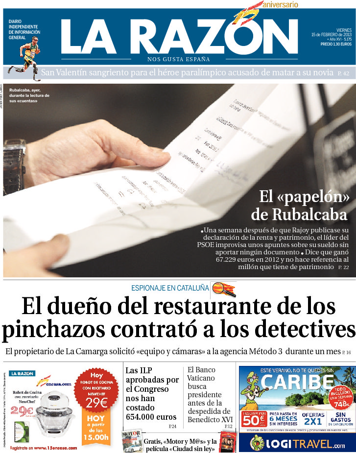 "El 'papelón' de Rubalcaba", "El dueño del restaurante de los pinchazos contrató a los detectives"