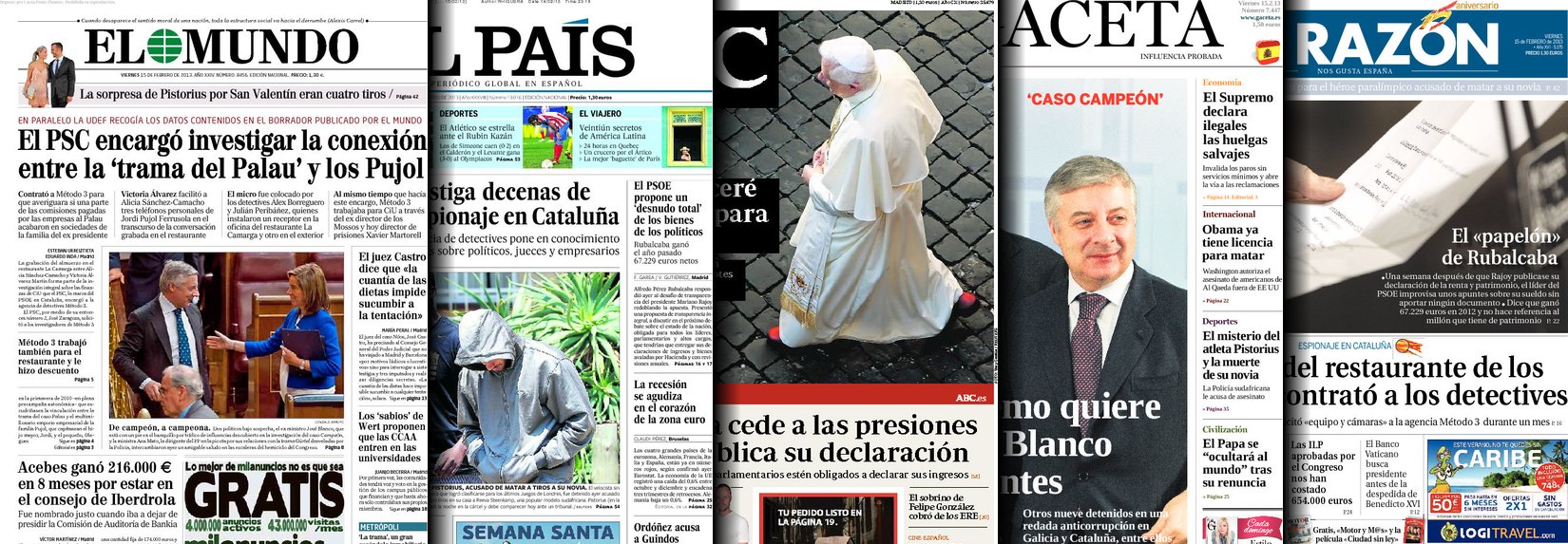 Portadas de los diarios El Mundo, El País, ABC, La Razón, La Vanguardia, La Gaceta, El Periódico, Cinco Días, Expansión, El Economista, Marca, AS, Sport y Mundo Deportivo.