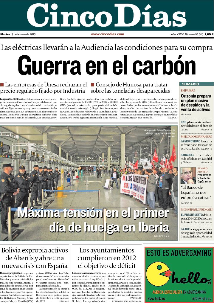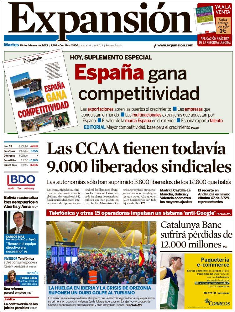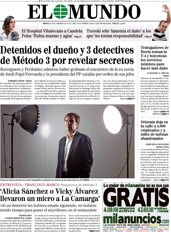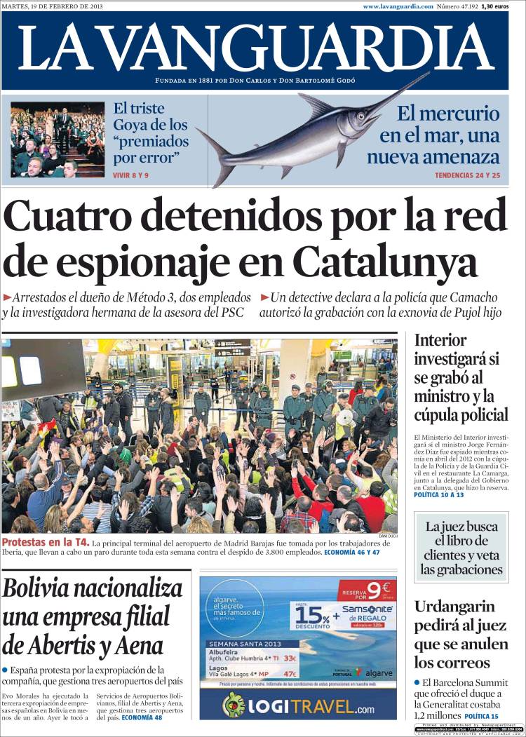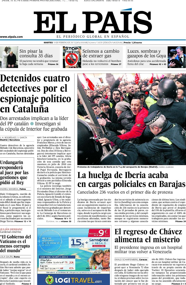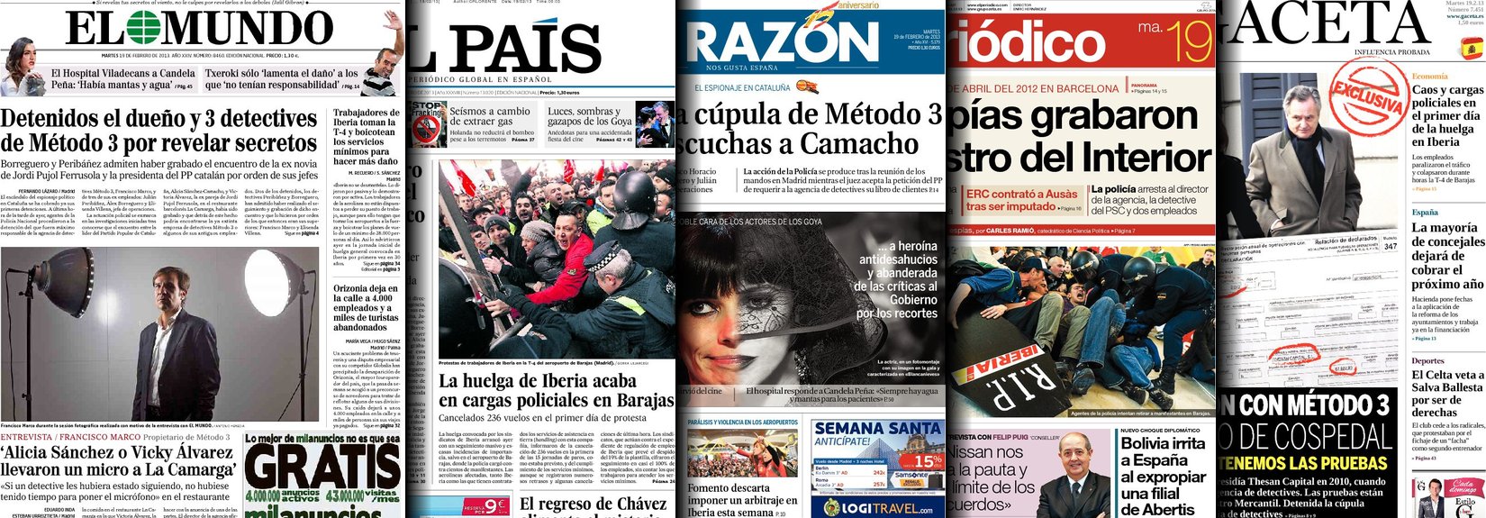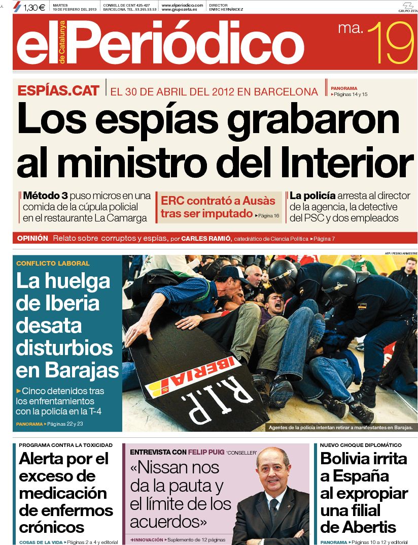 "Detenidos cuatro detectives por el espionaje político en Cataluña";"La huelga de Iberia acaba en cargas policiales en Barajas"