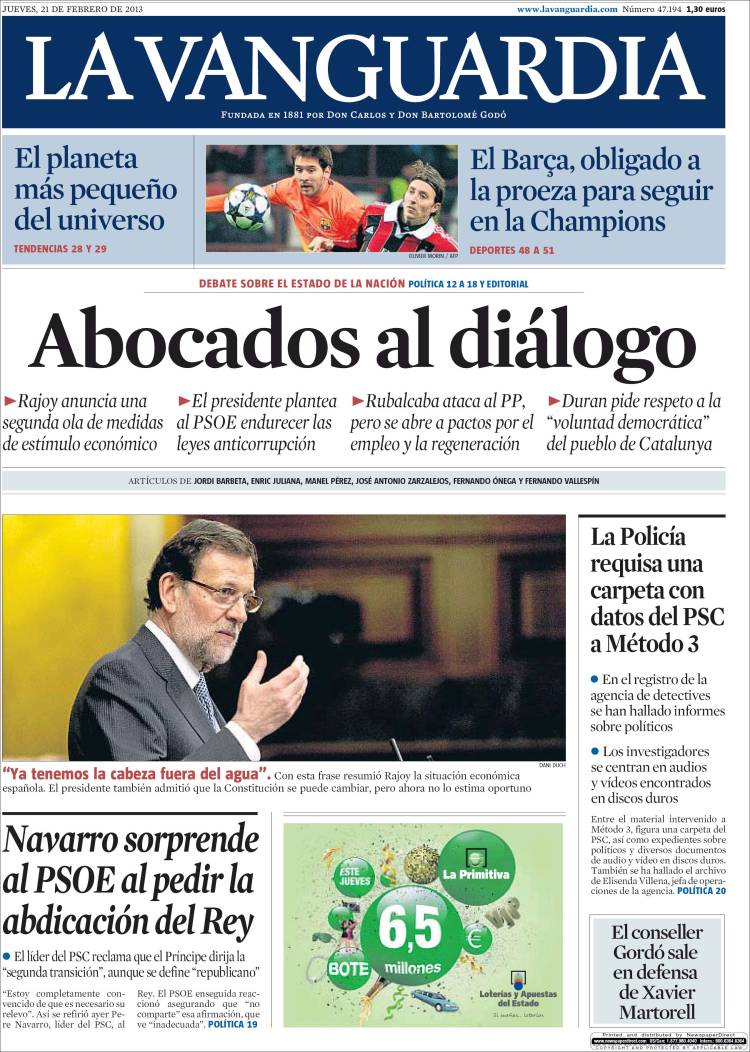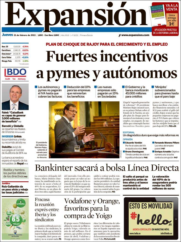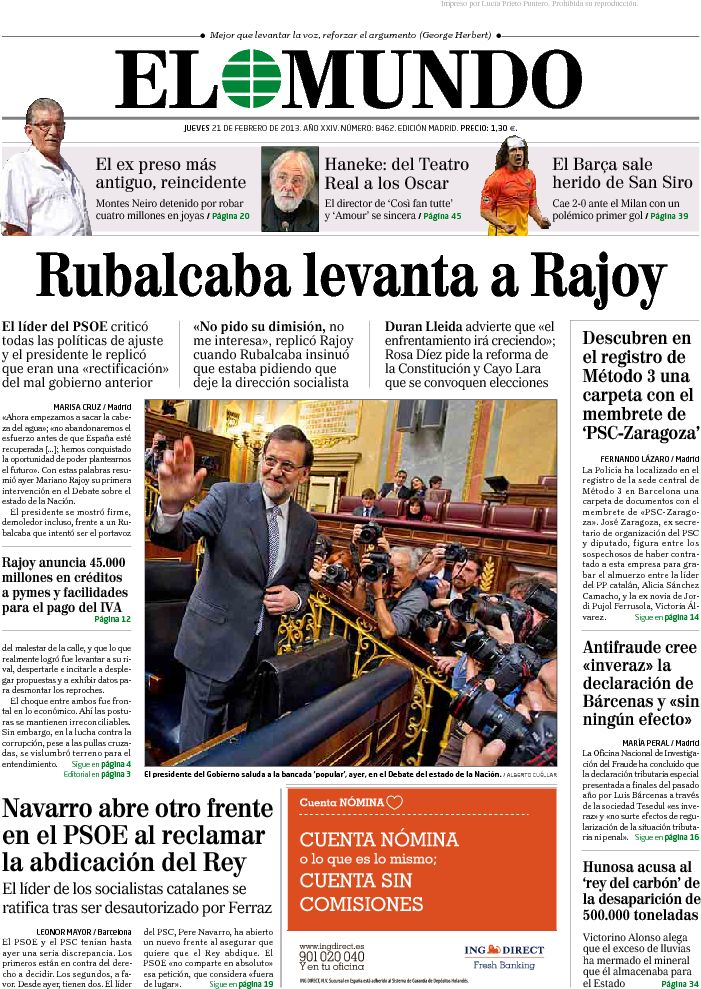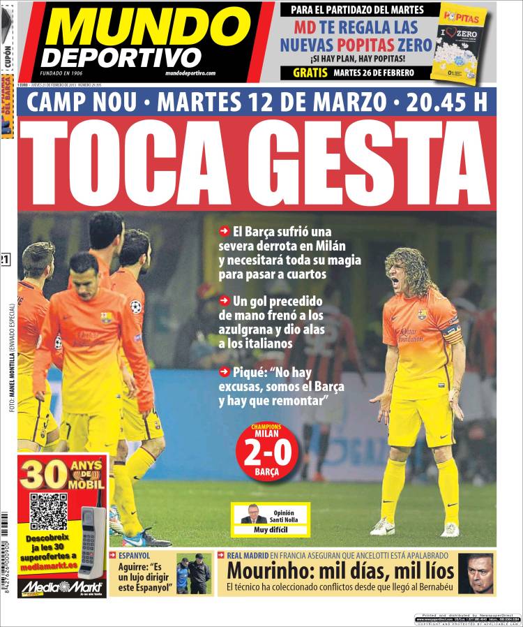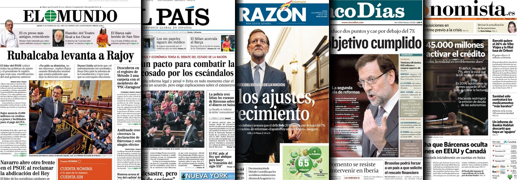 Portadas de los diarios El Mundo, El País, ABC, La Razón, La Vanguardia, La Gaceta, El Periódico, Cinco Días, El Economista, Expansión, Marca, As, Mundo Deportivo y Sport.