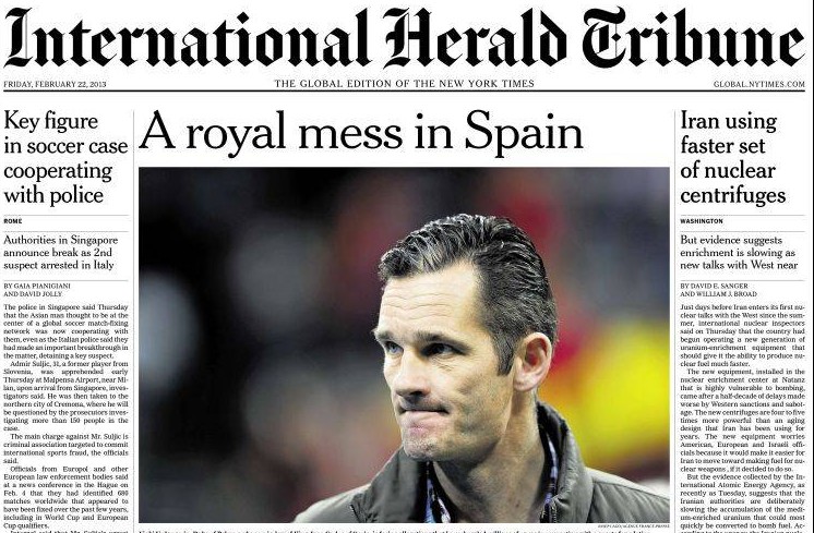 Apenas 24 horas antes de la nueva declaración de Iñaki Urdangarín, The New York Times centra la atención en el yerno del Rey. El diario publica en su portada una fotografía del duque, junto a una información en la que da cuenta de las últimas novedades respecto al tema. Además, en la versión internacional del NYT, el International Herald Tribune, Urdangarín es la principal noticia de apertura con un gran titular: "Un follón Real".