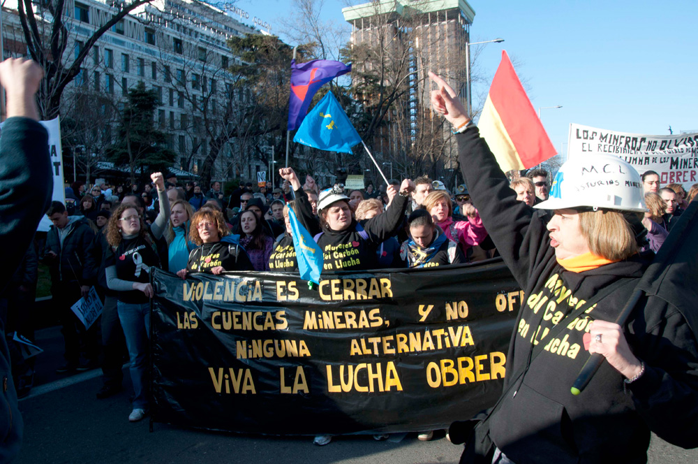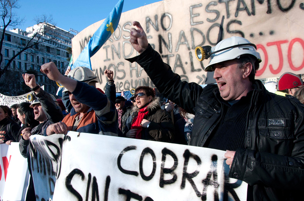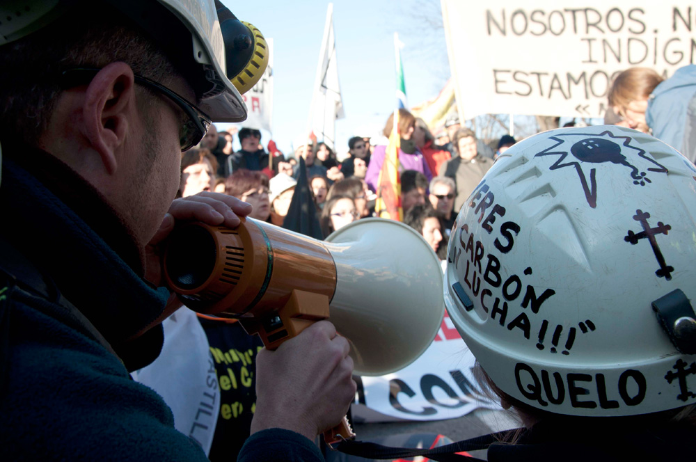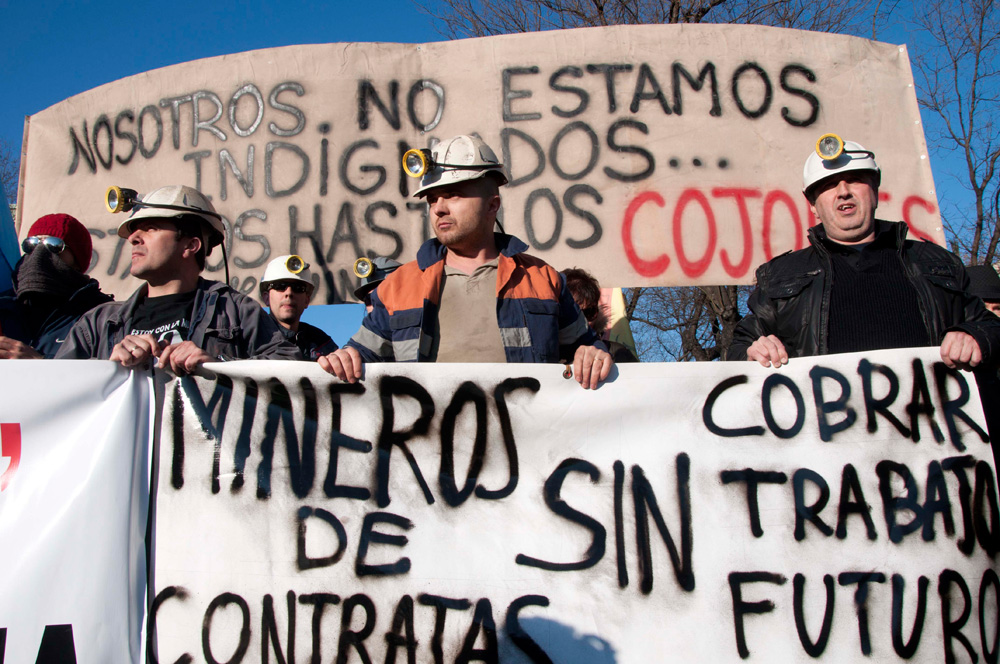 "Nosotros no estamos indignados, estamos hasta los cojones", se puede leer en la gran pancarta situada a la espalda de los mineros.