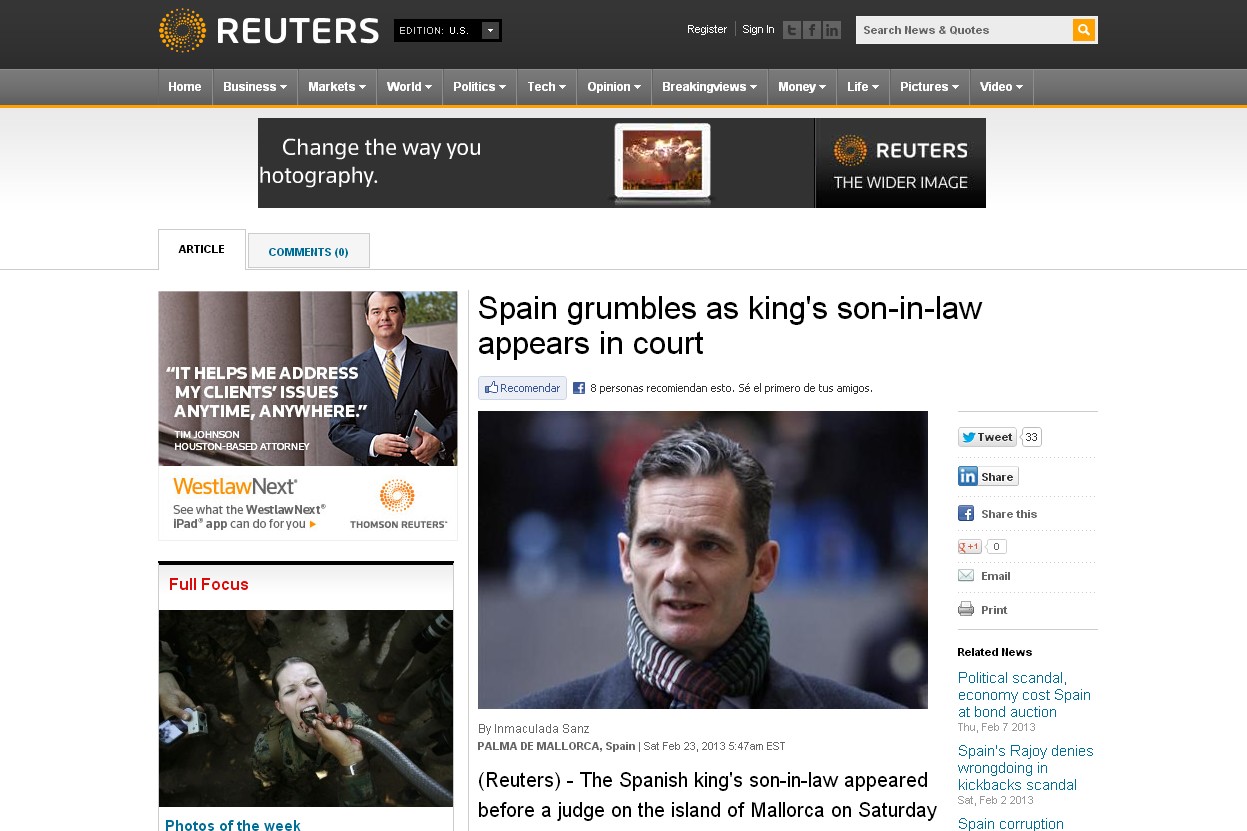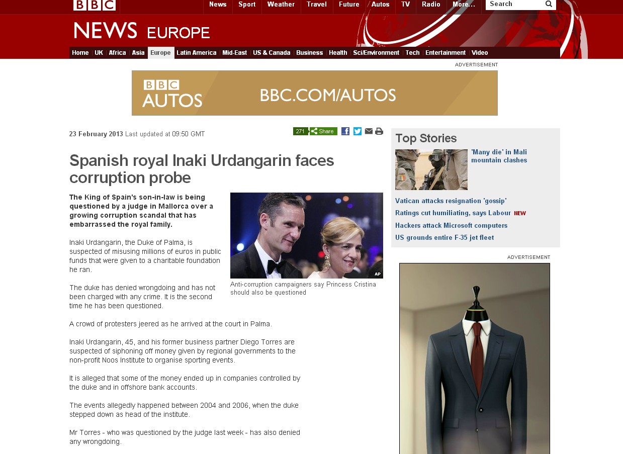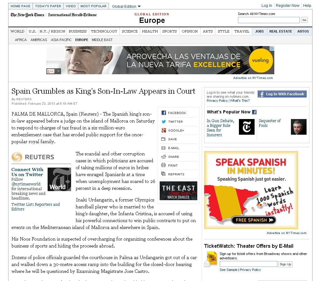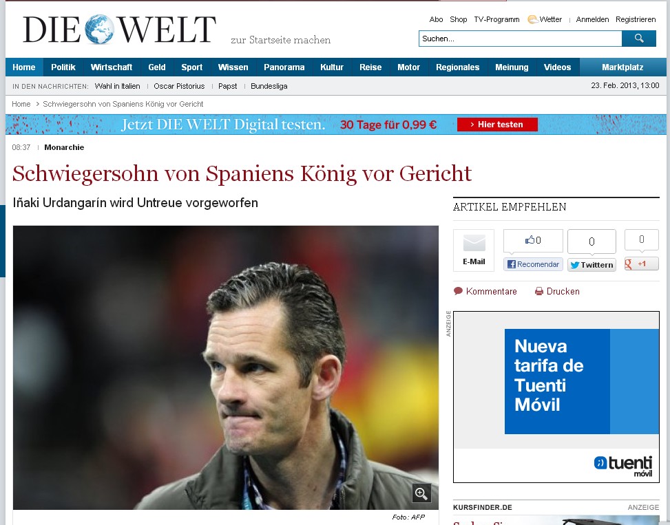 Una de las cabeceras más importantes de Alemania, el Die Welt, publica en su web la noticia: "El yerno del rey, ante el juez".