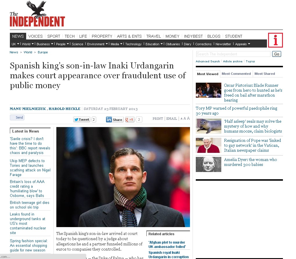 La cabecera británica informa que "El yerno del Rey Iñaki Urdangarín aparece en el juzgado por el uso fraudulento de fondos públicos", señala en su web.