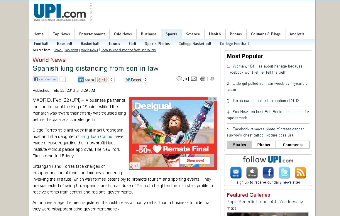 La agencia norteamericana United Press International (UPI) centra su información en el distanciamiento del Rey de su yerno.