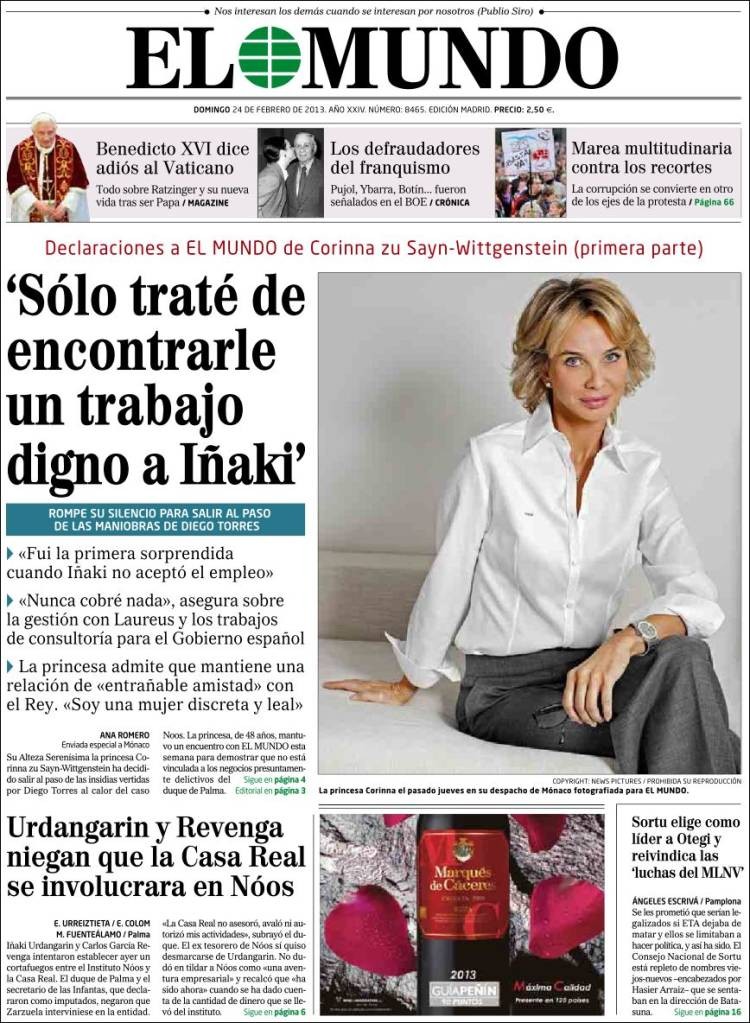 Corinna zu Sayn-Wittgenstein, a El Mundo: "Sólo traté de encontrarle un trabajo digno a Iñaki"