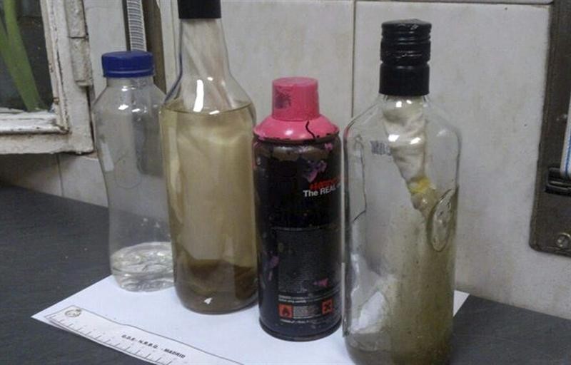 Imagen cedida por la Policía Nacional del material encontrado en una mochila, indicado para la fabricación de cócteles molotov, durante los disturbios originados en Madrid tras la llamada "marea social"