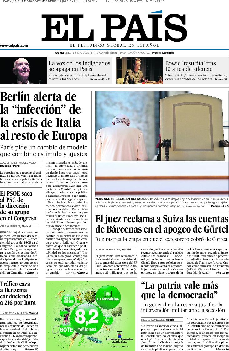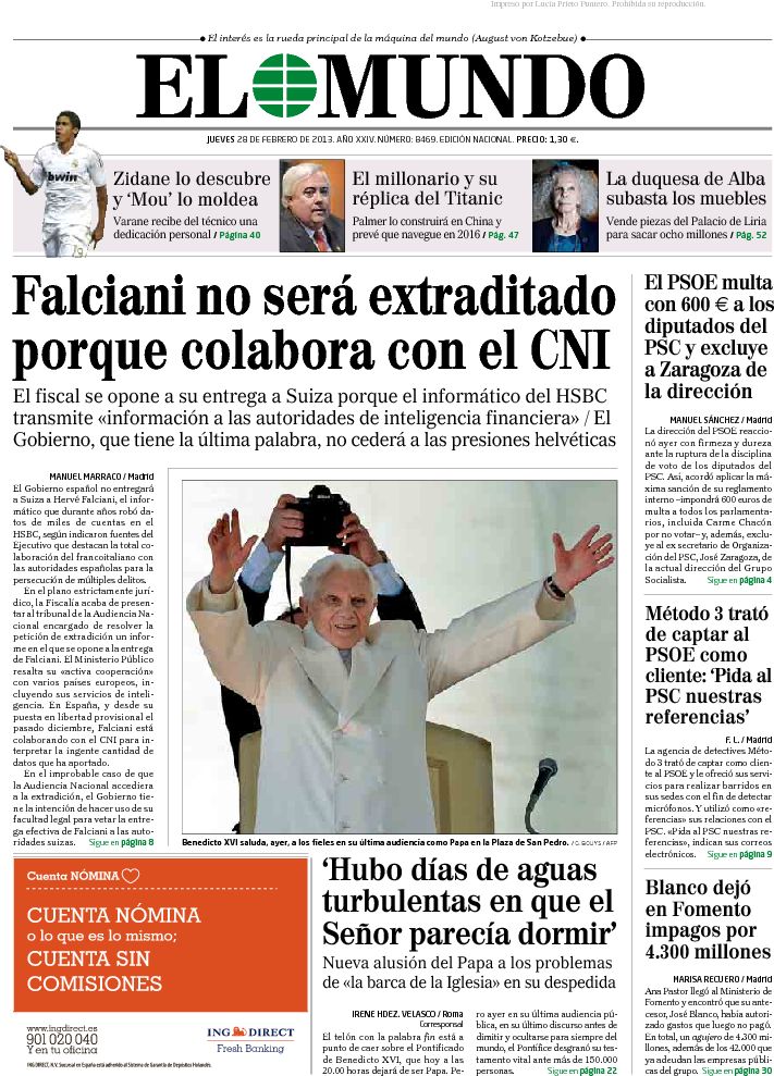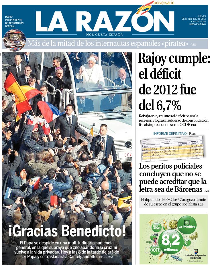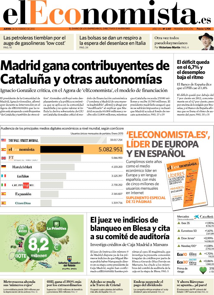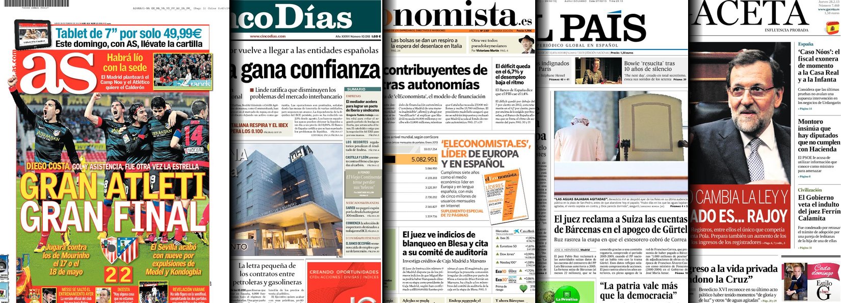 Portadas de los diarios El Mundo, El País, ABC, La Razón, La Vanguardia, La Gaceta, El Periódico, Cinco Días, El Economista, Expansión, Marca, As, Mundo Deportivo y Sport.