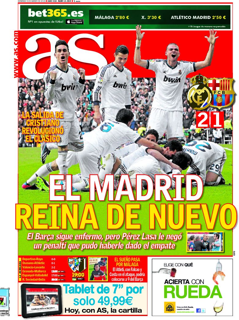 Portadas de los diarios ABC, El País, La Razón, La Gaceta, El Periódico, As y La Vanguardia.