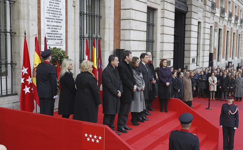 El presidente de la Comunidad de Madrid, Ignacio González, la alcaldesa de Madrid, Ana Botella, el secretario general del PSM, Tomás Gómez, el portavoz del PP en la Asamblea de Madrid, Íñigo Henríquez de Luna, el portavoz de UPyD, Luis de Velasco, y la presidenta de la Asociación de Víctimas del 11-M, Ángeles Domínguez, durante el homenaje a las víctimas del 11-M en Sol.