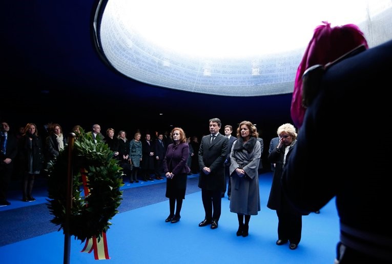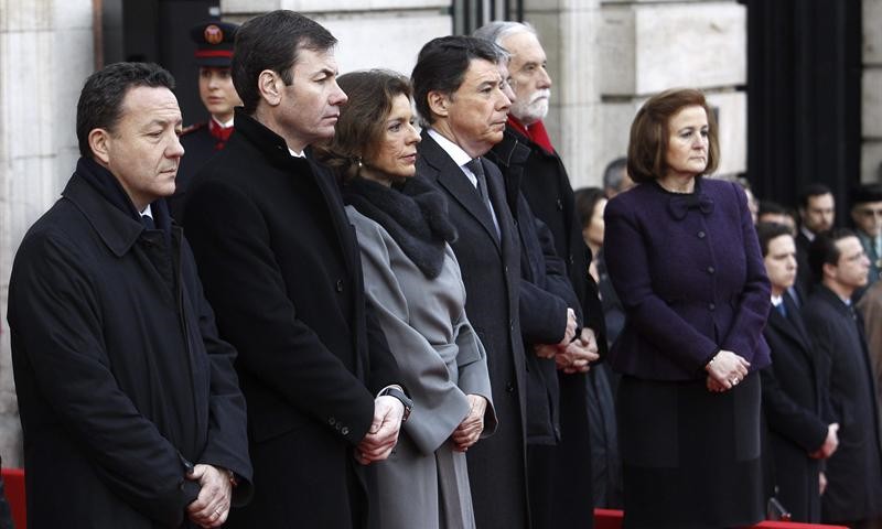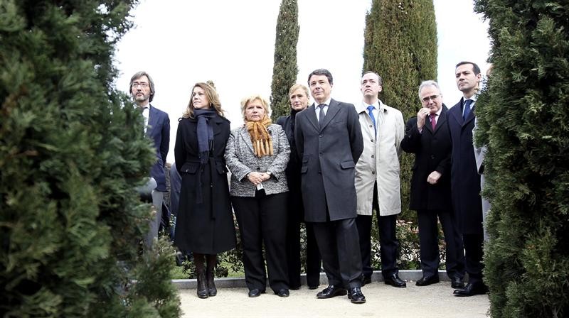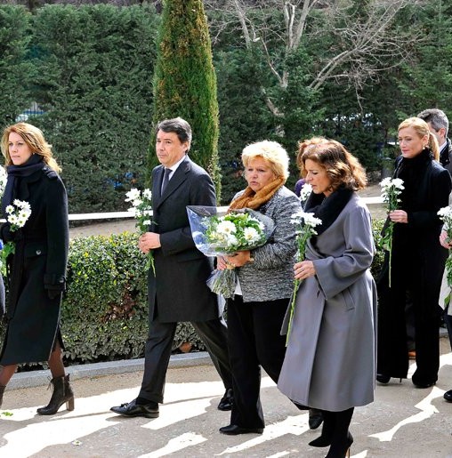 El presidente de la Comunidad de Madrid, Ignacio González (3d), la alcaldesa de Madrid, Ana Botella (4d), el secretario general del PSM, Tomás Gómez (4i), el portavoz del PP en la Asamblea de Madrid, Íñigo Henríquez de Luna (3i), el portavoz de UPyD, Luis de Velasco (2d), la presidenta de la Asociación de Víctimas del Terrorismo (AVT), Ángeles Pedraza (2i), la presidenta de la Asociación de Víctimas del 11-M, Ángeles Domínguez (d) y María del Mar Blanco (i), hermana del concejal del PP asesinado por ETA Miguel Angel Blanco
