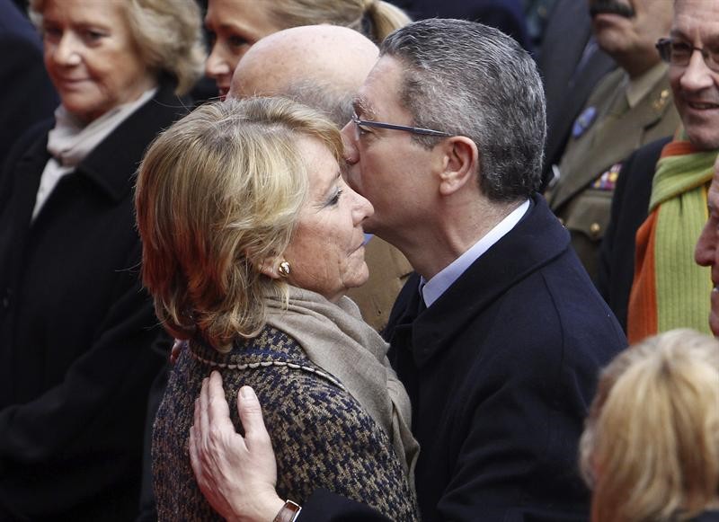 Gallardón saluda a Esperanza Aguirre, a su llegada al homenaje a las víctimas.