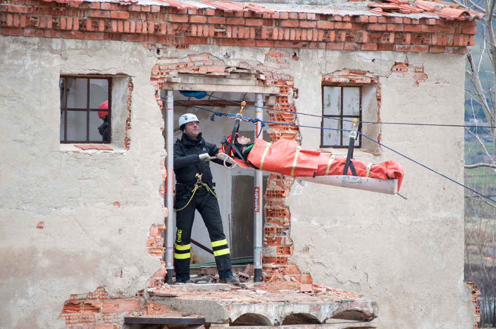 En el simulacro de emergencia se dispuso de la forma más real posible. En la foto puede observarse cómo es trasladado un herido desde un edificio hasta el suelo