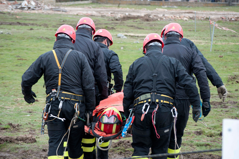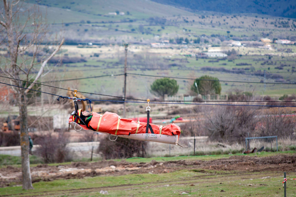 Desde el suelo, varios efectivos de la UME desplazan al herido y supervisan que no se cometan fallos
