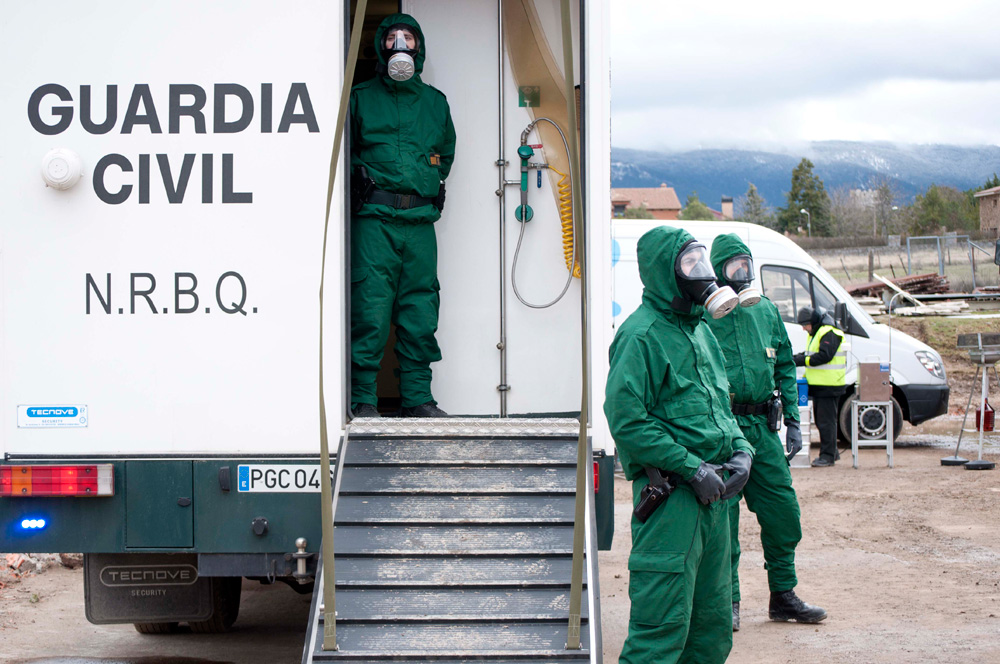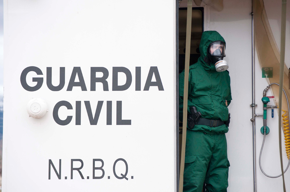 Un Guardia Civil, ataviado con el traje N.R.B.Q. vigila la entrada del vehículo