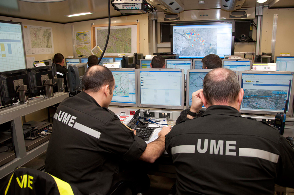 Multitud de pantallas y efectivos en el centro de mando de la UME