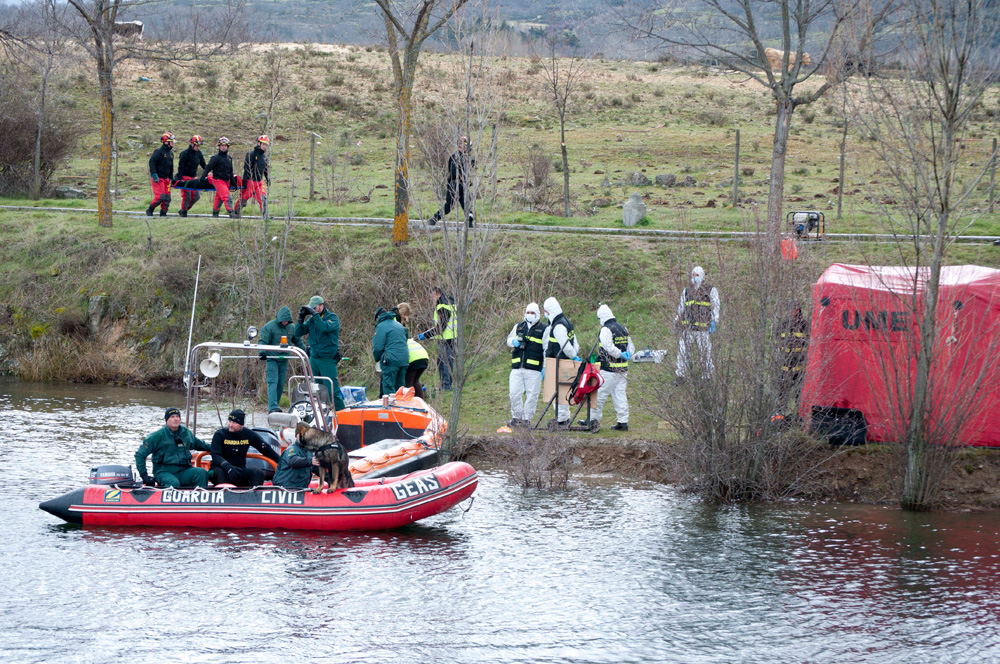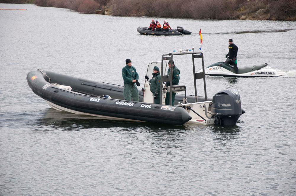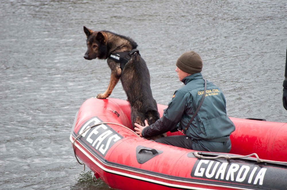 Efectivos de los Grupos de Especialistas en Actividades Subacuáticas (GEAS) de la Guardia Civil con un perro rastreador en la presa del Pontón