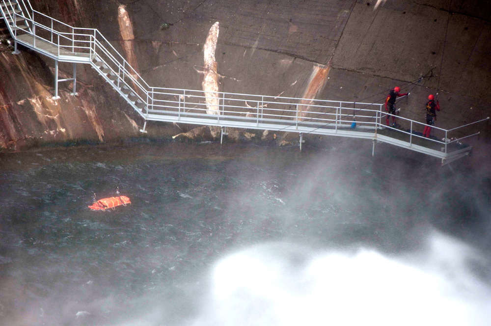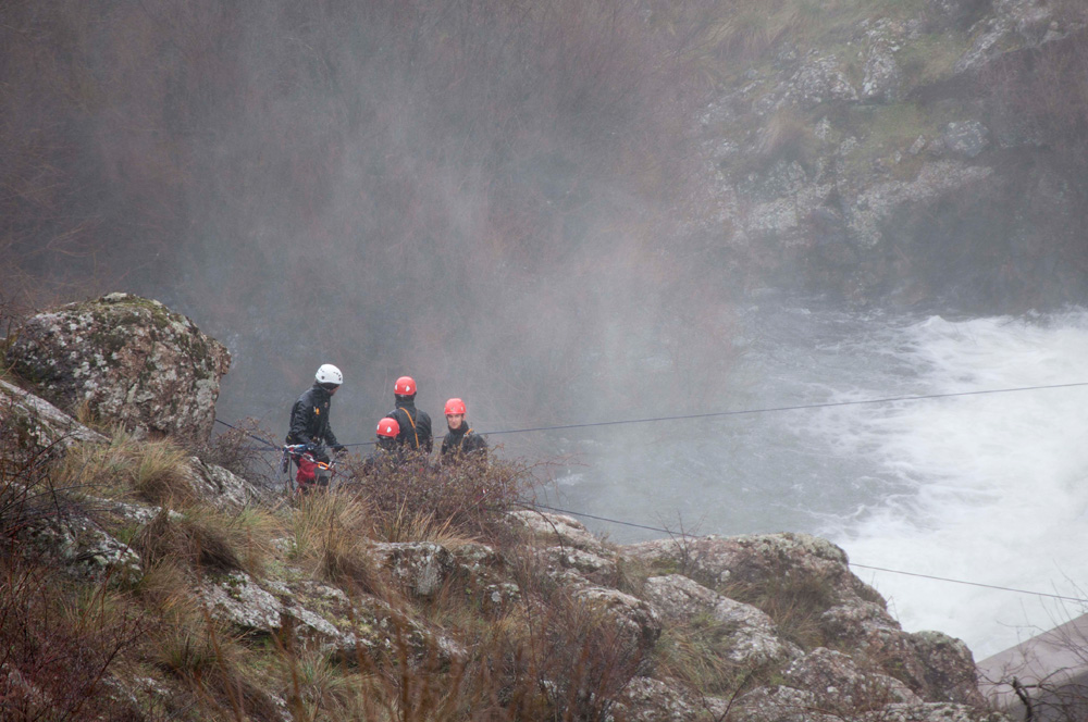 Miembros de la Unidad Militar de Emergencias (UME) realizan un salvamento en la presa del Pontón