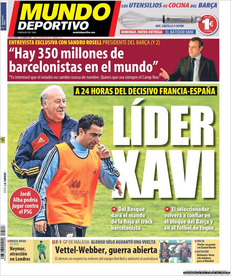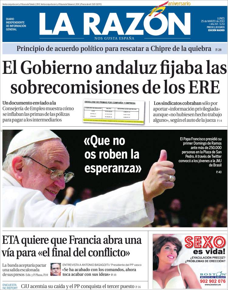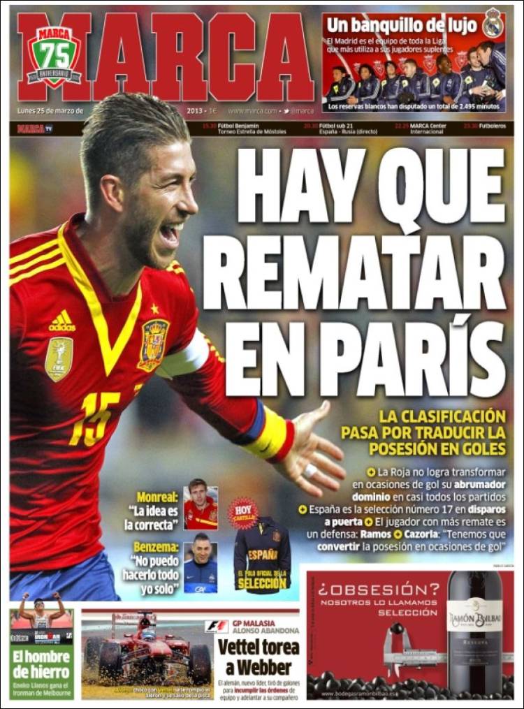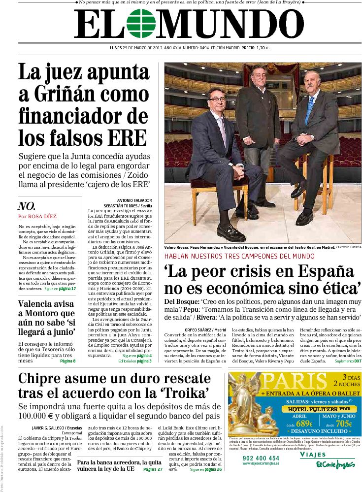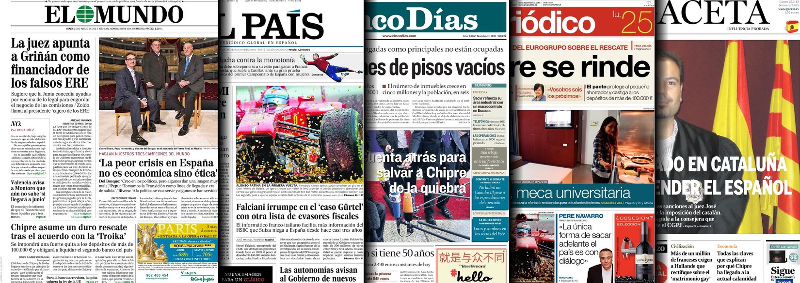 Portadas de los diarios El Mundo, El País, ABC, La Razón, La Vanguardia, La Gaceta, El Periódico, Cinco Días, El Economista, Expansión, Marca, As, Mundo Deportivo y Sport.