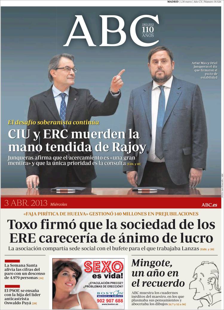 "CIU y ERC muerden la mano tendida de Rajoy";"Toxo firmó que la sociedad de los ERE carecería de ánimo de lucro"