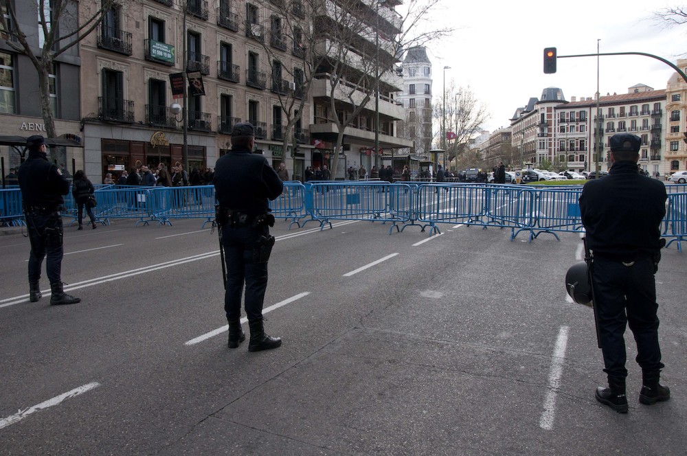 Tres policías vigilan la entrada a la calle Génova desde la glorieta de Alonso Martínez en Madrid