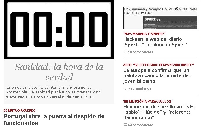 Tal día como hoy, 10 de abril, pero de 2012, Libertad Digital contaba en su portada la actuación de unos piratas informáticos que hackearon la página web del diario deportivo catalán y titulaba: "Hackean la web del diario Sport: "Cataluña is Spain". El hacker colgó en numerosas partes de la página web el mensaje: "Hoy, mañana y siempre CATALUÑA IS SPAIN". El ataque, firmado por Dav0, duró pocos minutos pero obtuvo una gran repercusión gracias a las redes sociales.