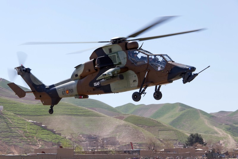 El helicóptero de combate HA-28 Tigre despega de su base para cumplir con su primera misión en Afganistán.