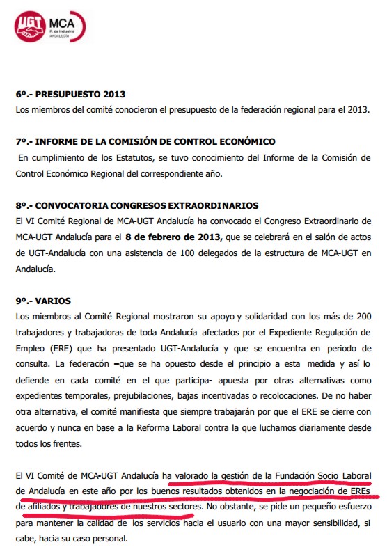 Que la Fundación interviene en los ERE que se producen en Andalucía es un hecho demostrable que aparece reflejado en los documentos de UGT Andalucía. En el acta del VI Comité Ordinario de Metal, Construcción y Afines, Federación de Industria, de la Unión General de Trabajadores en Andalucía, se dice textualmente: ""El VI Comité de MCA-UGT Andalucía ha valorado la gestión de la Fundación Socio Laboral de Andalucía en este año por los buenos resultados obtenidos en la negociación de EREs de afiliados y trabajadores de nuestros sectores. No obstante, se pide un pequeño esfuerzo para mantener la calidad de los servicios hacia el usuario con una mayor sensibilidad, si abe, hacia su caso personal".