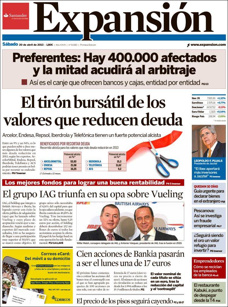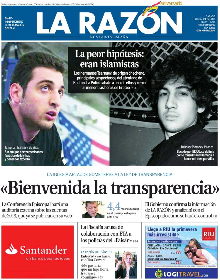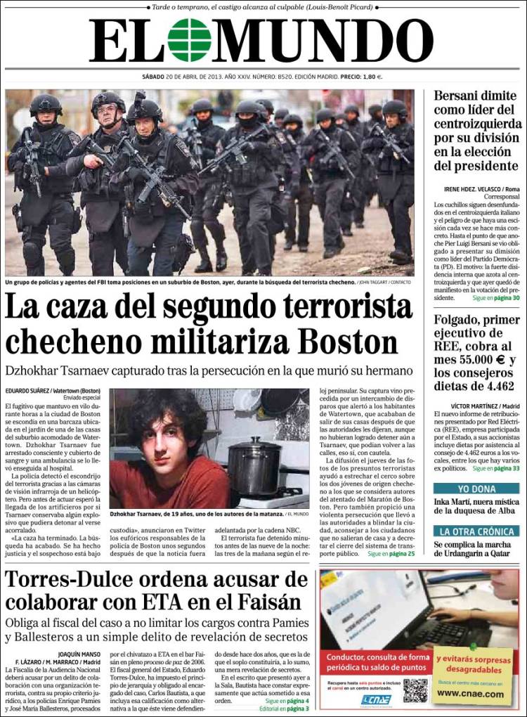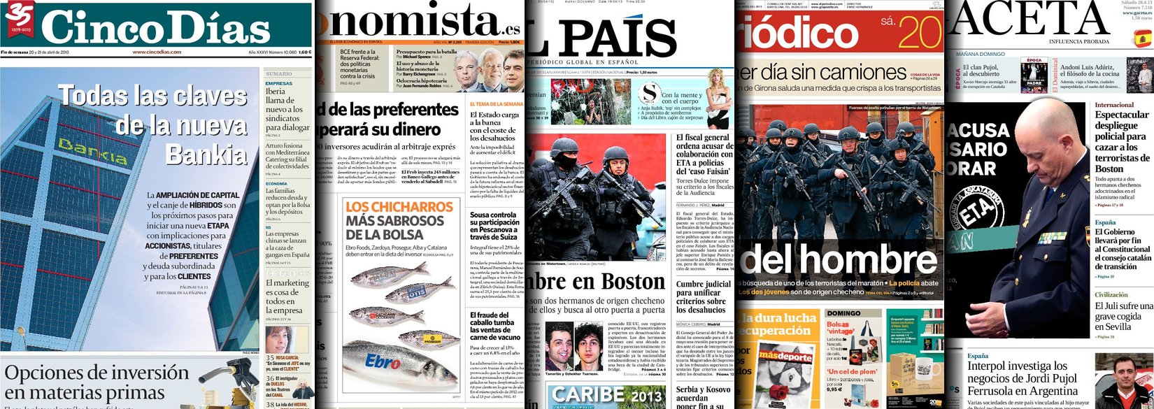 Portadas de los diarios El Mundo, El País, ABC, La Razón, La Gaceta, La Vanguardia, El Periódico, Expansión, el Economista, Cinco Días, Marca, As, Mundo Deportivo y Sport.