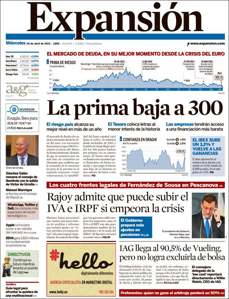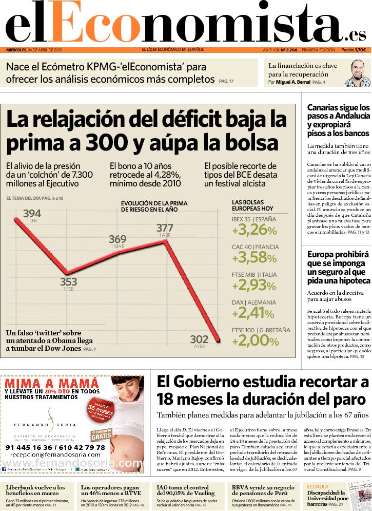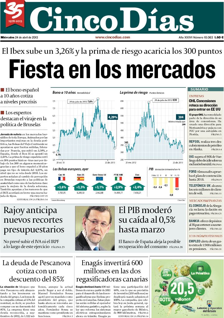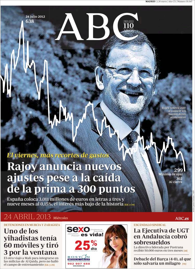 "Rajoy anuncia nuevos ajustes pese a la caída de la prima a 300 puntos"