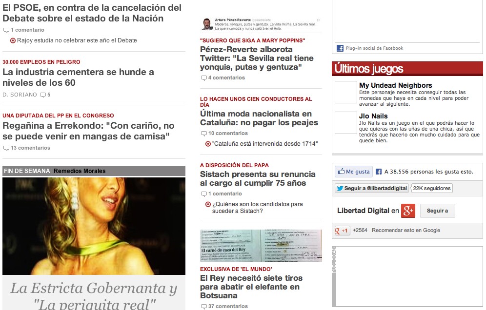 Tal día como hoy, 29 de abril, pero de 2012, Libertad Digital contaba en su portada la última polémica del escritor Arturo Pérez-Reverte en la red social Twitter por uno de sus comentarios. El motivo fue el tuit que subió que escribió después de haber visto la película Grupo 7: "Maderos, putas, yonquis y gentuza. La vida misma. La Sevilla real. La que incomoda y nunca saldrá en el Hola".
