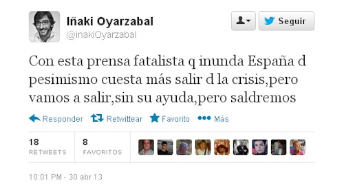 Según Iñaki Oyarzabal, "con esta prensa fatalista que inunda España de pesimismo cuesta más salir de la crisis, pero vamos a salir, sin su ayuda, pero saldremos", ha dicho.