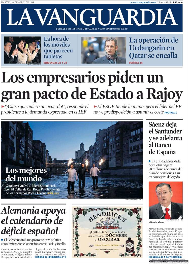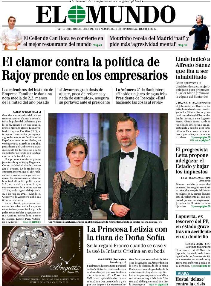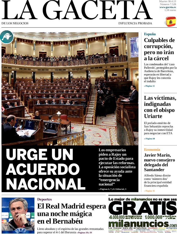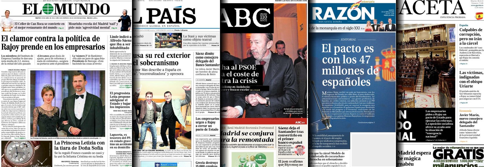 Portadas de los diarios El Mundo, El País, ABC, La Razón, La Vanguardia, La Gaceta, El Periódico, Cinco Días, El Economista, Expansión, Marca, As, Mundo Deportivo y Sport.