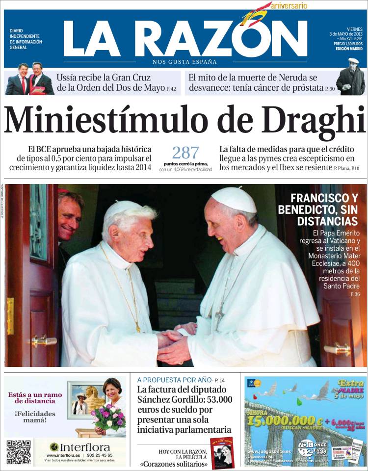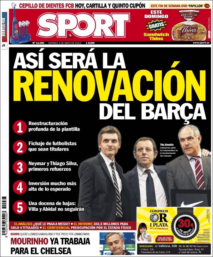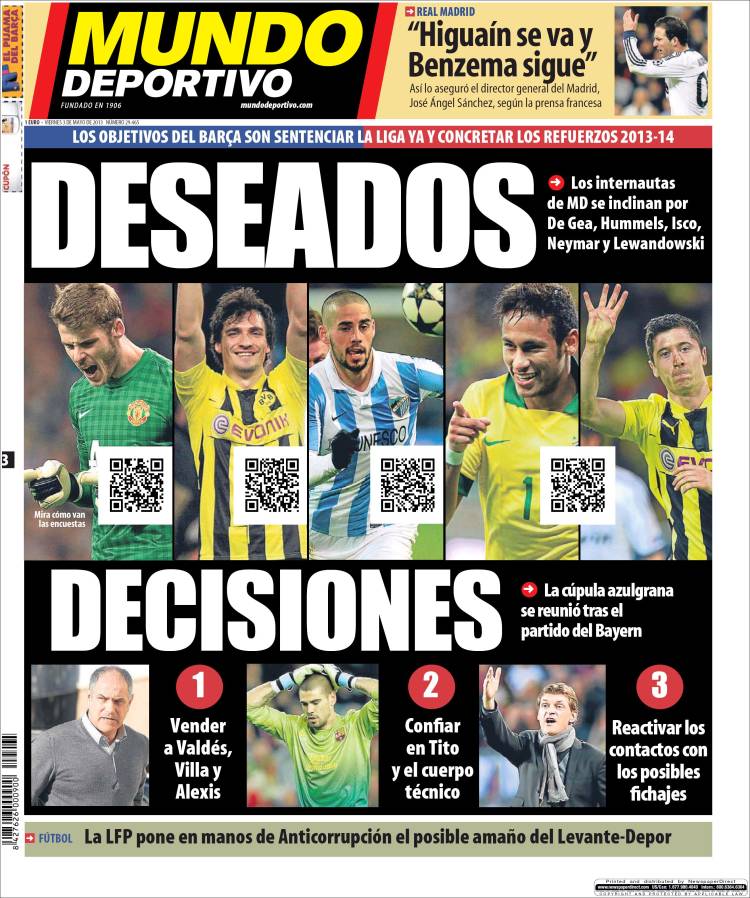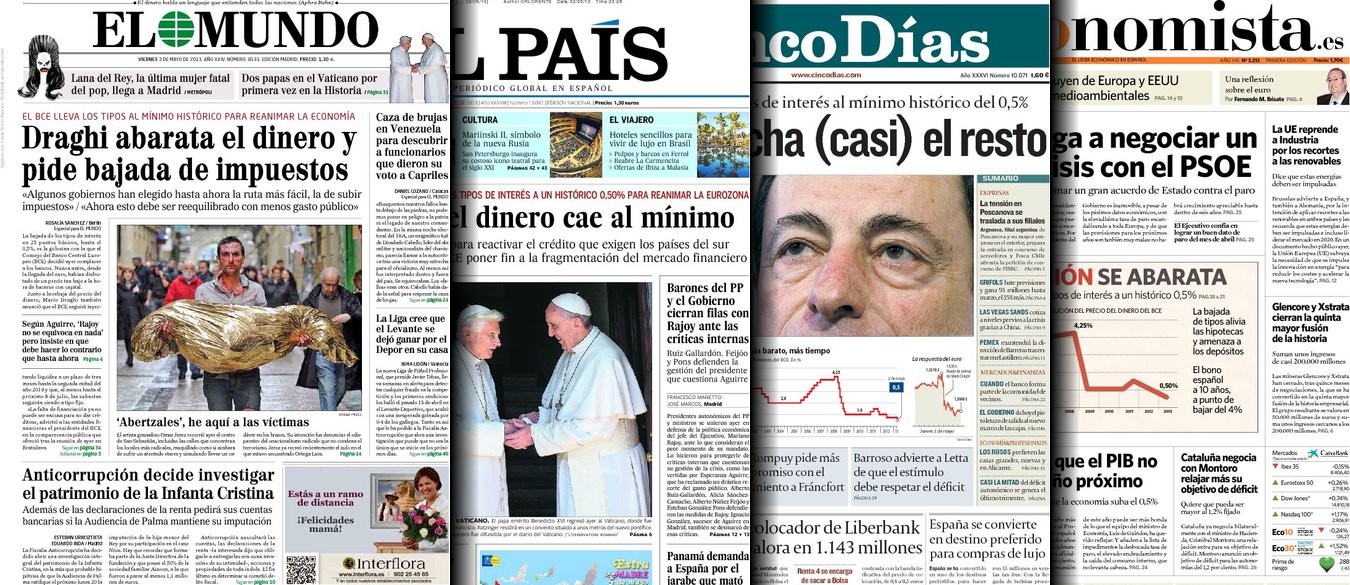 Portadas de los diarios El Mundo, El País, ABC, La Razón, La Gaceta, La Vanguardia, El Periódico, Expansión, el Economista, Cinco Días, Marca, As, Mundo Deportivo y Sport.