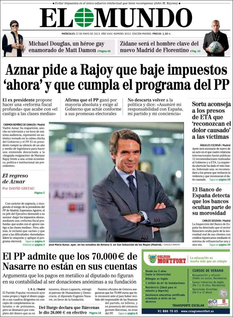 "Aznar pide a Rajoy que baje impuestos 'ahora' y que cumpla el programa del PP"