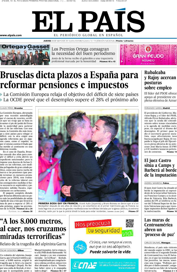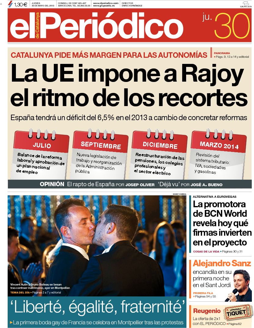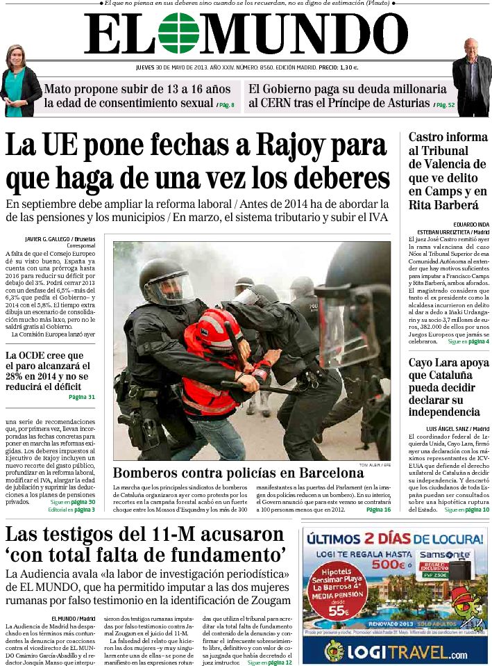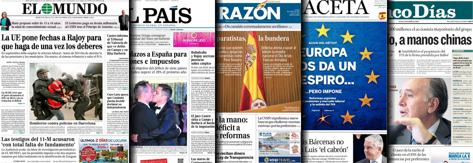 Portadas de los diarios El Mundo, El País, ABC, La Razón, La Vanguardia, La Gaceta, El Periódico, Cinco Días, El Economista, Expansión, Marca, As, Mundo Deportivo y Sport.