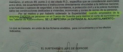 "Por tal motivo y por orden de la superioridad, cuando los empleados de la empresa Endesa se personen en el Cuerpo de Guardia para realizar el corte de suministro en los Talleres de Automovilismo, se les impedirá la entrada al acuartelamiento", dice textualmente el oficio.
