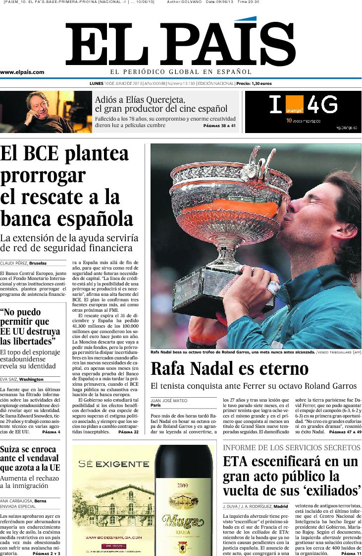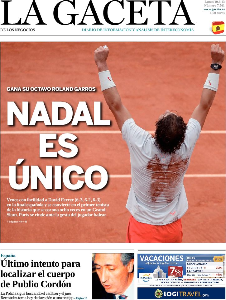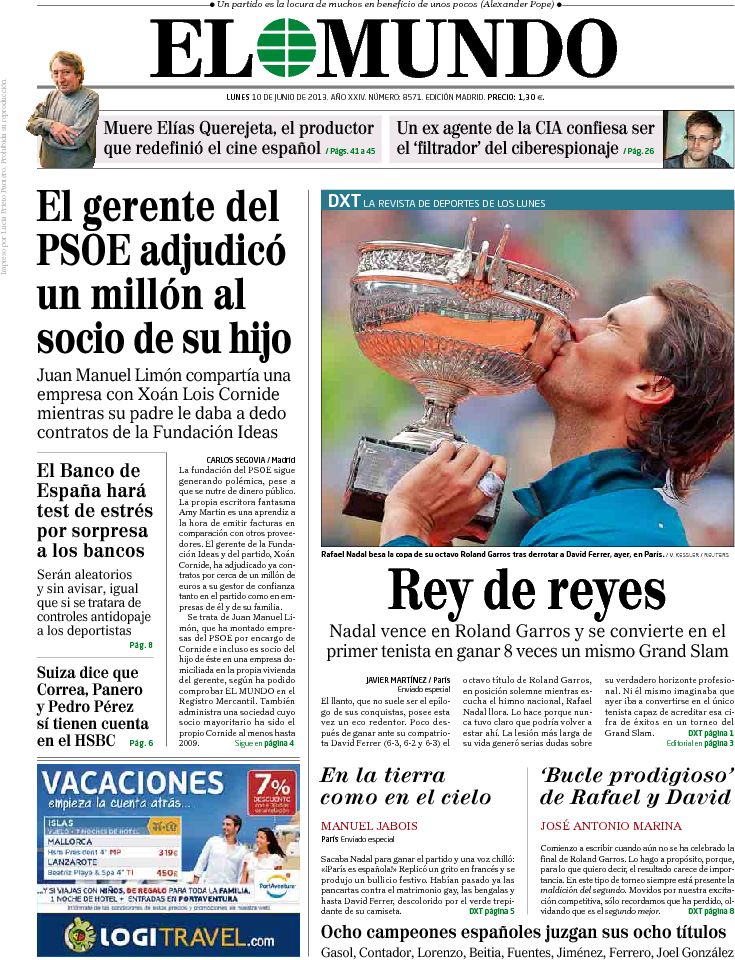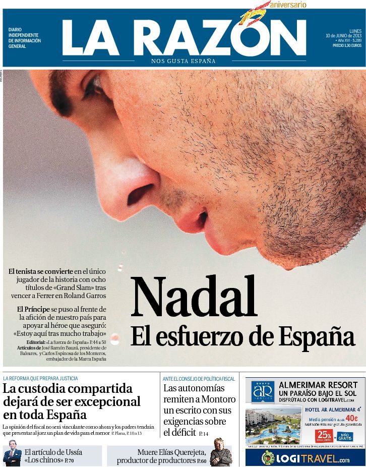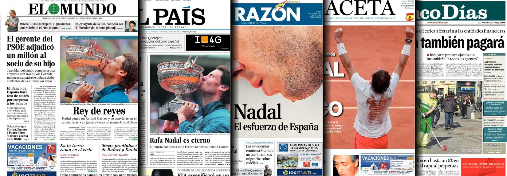 Portadas de los diarios El Mundo, El País, ABC, La Razón, La Vanguardia, La Gaceta, El Periódico, Cinco Días, El Economista, Expansión, Marca, As, Mundo Deportivo y Sport.