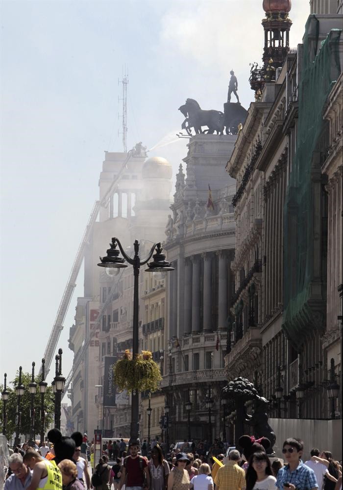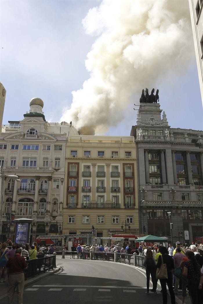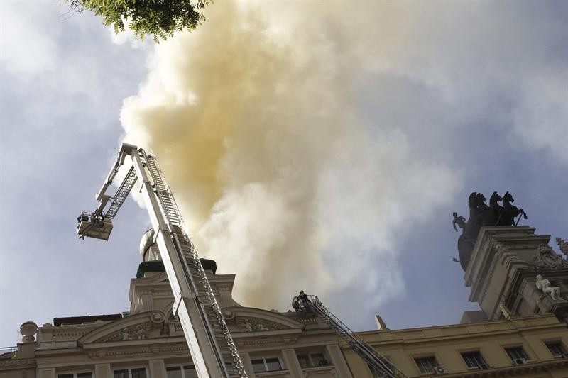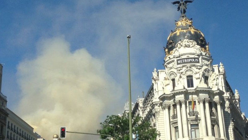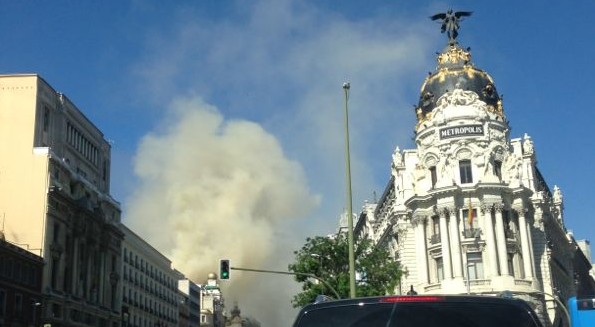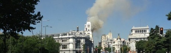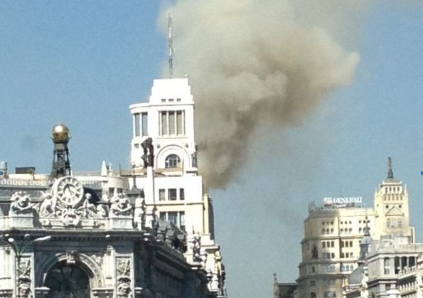 Columna de humo vista desde la Plaza de Cibeles, con el Banco de España en primer plano