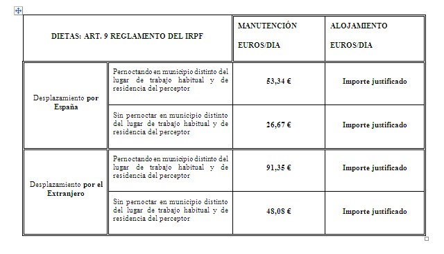 Las cuantías máximas no gravadas por el concepto de dietas de manutención y estancia que establece el Reglamento del IRPF son las siguientes: