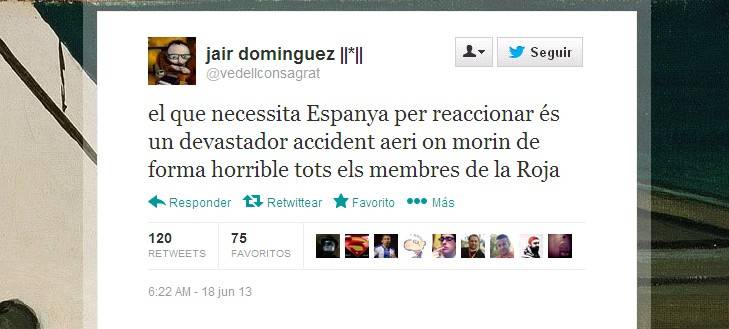 El guionista de varios programas de TV3 y que también ha trabajado para la productora de Buenafuente, Jair Domínguez, que acabó ante el juez por simular que mataba al Rey en un programa de la cadena pública catalana, ha deseado en Twitter la muerte de los jugadores de la selección española de fútbol para que "España reaccione":