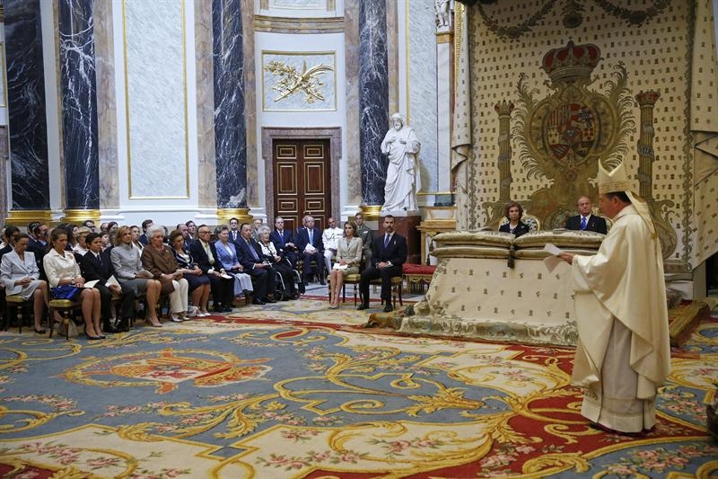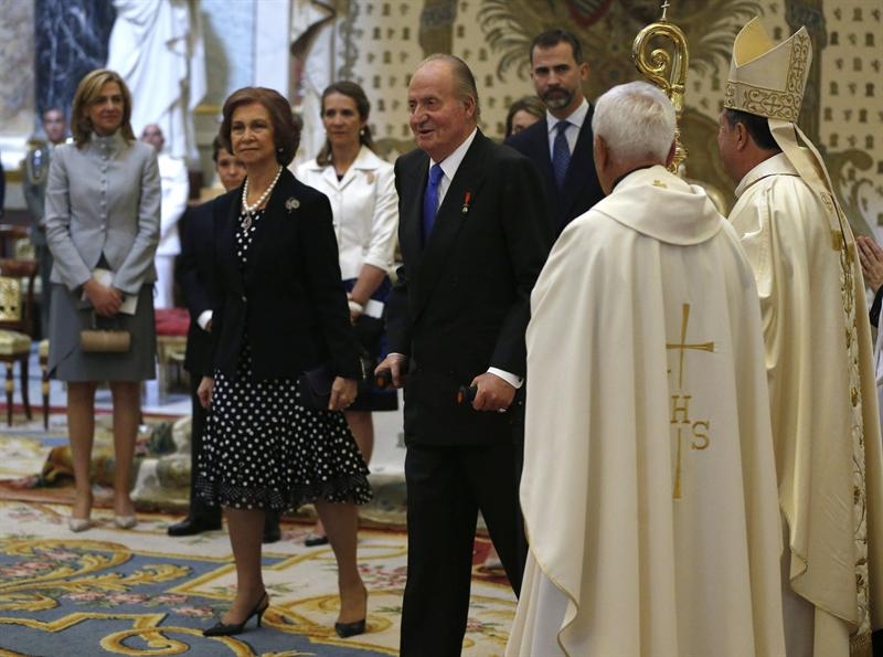 Los Reyes entran en la capilla del Palacio Real donde se celebró la misa. De fondo, sus hijos: Cristina, Elena y Felipe, acompañado de su mujer.