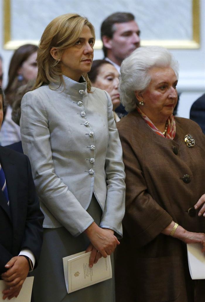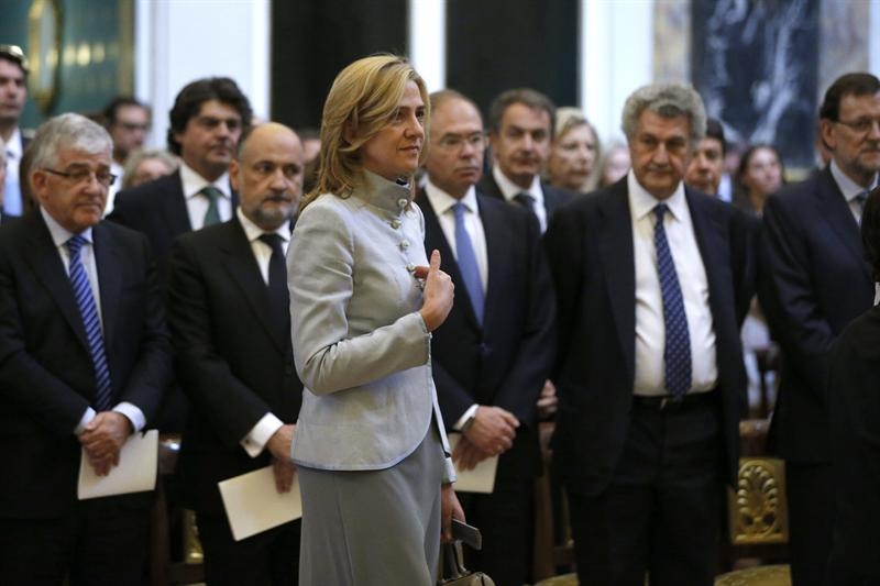 La infanta Cristina, junto al presidente del Consejo General del Poder Judicial (CGPJ), Gonzalo Moliner (i); el recién elegido presidente del Tribunal Constitucional, Francisco Pérez de los Cobos (2i); el presidente del Senado, Pío García Escudero (3d), y el del Congreso, Jesús Posada (2d), y el titular del Gobierno, Mariano Rajoy (d)