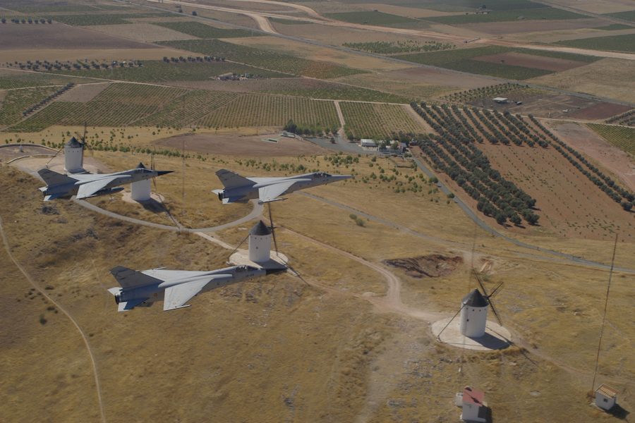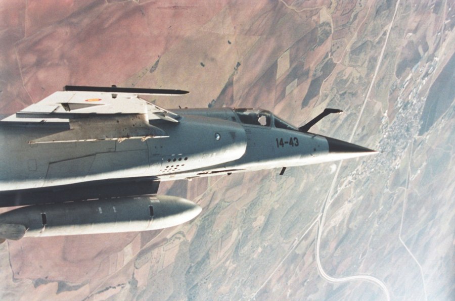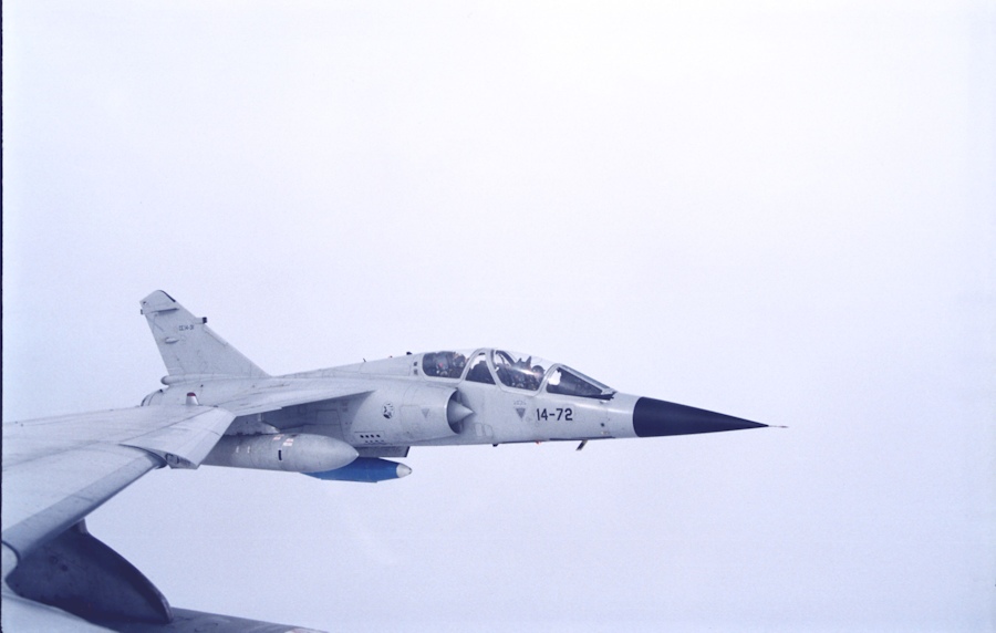 Vuelo del Dassault Mirage F1 visto desde la cabina de otro caza del mismo modelo que vuela junto a él en formación.