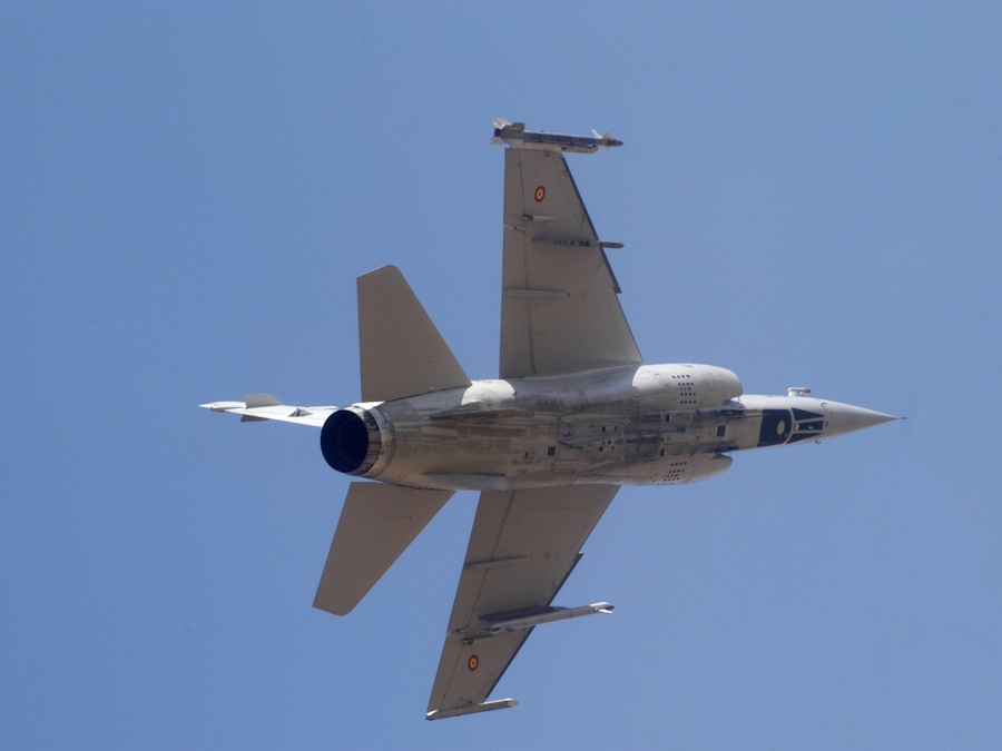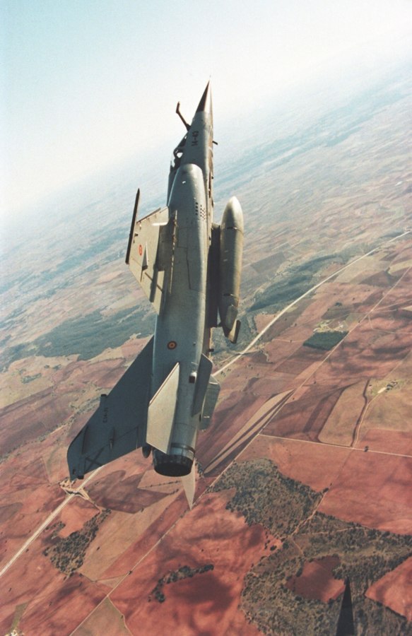 Vista lateral del vuelo de un Mirage F1 iniciando un descenso.