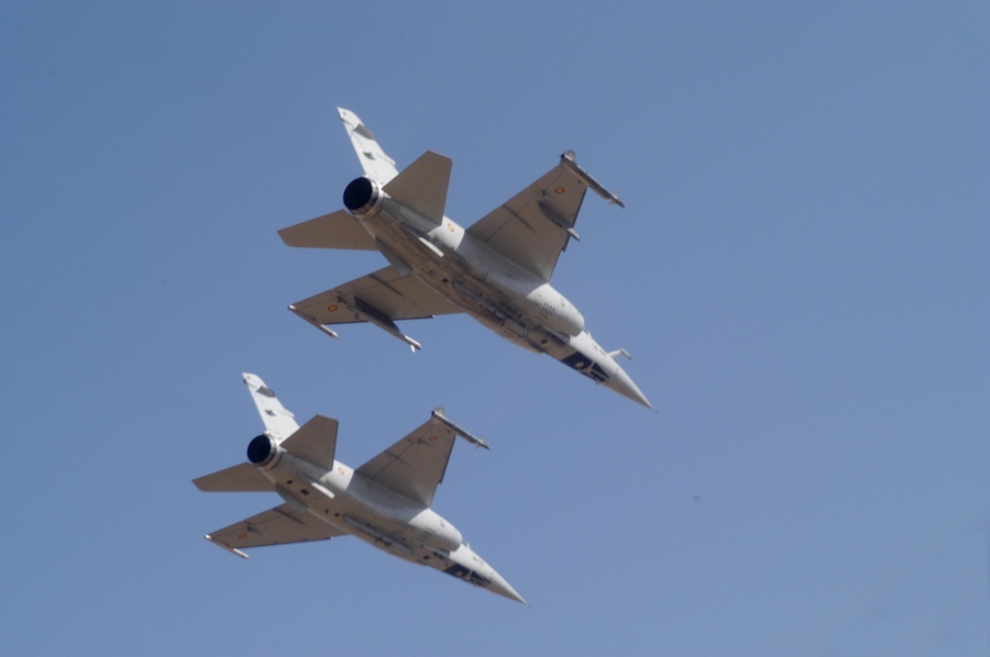 Perspectiva inferior de un vuelo en formación de dos Mirage F1.